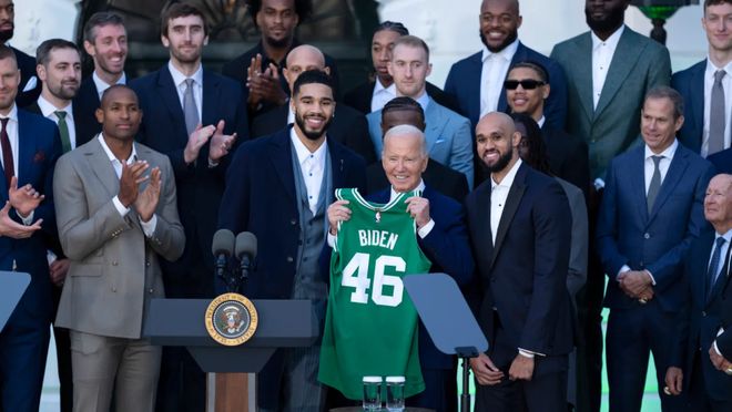 上一支造訪白宮的NBA冠軍球隊是凱爾特人隊,他們在2024年6月擊敗達拉斯獨行俠隊奪冠後,於2024年11月前往白宮。當時的總統是拜登。