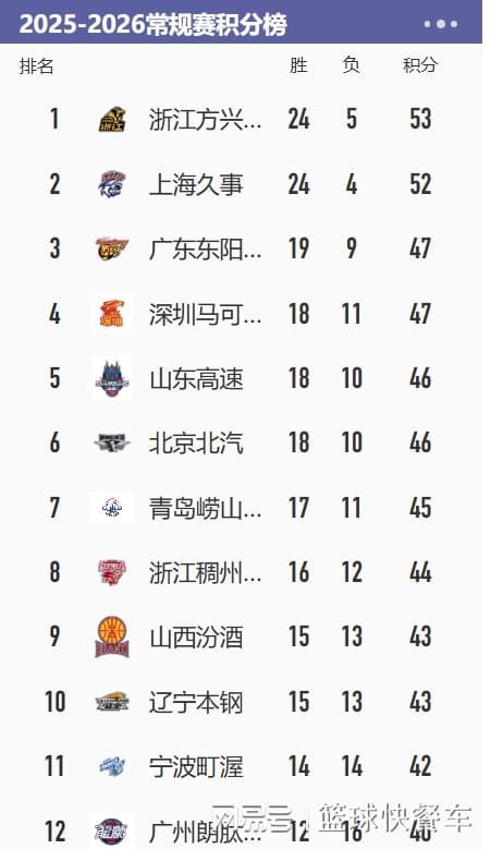 附:CBA積分榜最新排名