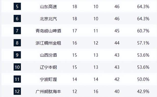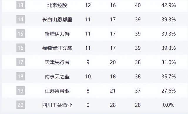 中遊集團競爭激烈:寧波隊14勝14負勝率持平,廣州與北控同為12勝16負,暫列第12、13位,成為季後賽“守門員”;吉林、新疆、福建三隊11勝17負,仍保留理論沖擊季後賽的可能。