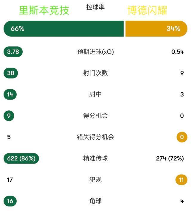 体坛周报全媒体报道欧冠1/8决赛次回合,里斯本竞技主场5比0大胜博德闪耀,上演超级大翻盘,总比分5比3晋级8强。第34分钟,里斯本竞技右侧角球,伊纳西奥头球先拔头筹。第42分钟,博德闪耀右侧角球,比约