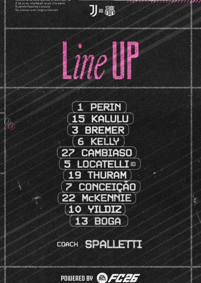 尤文首發:1-佩林、27-坎比亞索、15-卡盧盧、6-凱利、3-佈雷默、19-圖拉姆、22-麥肯尼、5-洛卡特利、7-孔塞桑、10-伊爾迪茲、13-博加
