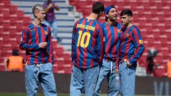 这一温情画面出现在巴萨对阵巴列卡诺的赛前热身环节。球员们统一身着2005-2006赛季、背后印有罗纳尔迪尼奥“10号”的经典球衣,重温那场标志性的巴黎欧冠决赛记忆。瞬间将人们带回那个属于“精灵小罗”的辉煌年代——他以华丽的球风与无与伦比的创造力,带领巴萨登上欧洲之巅。