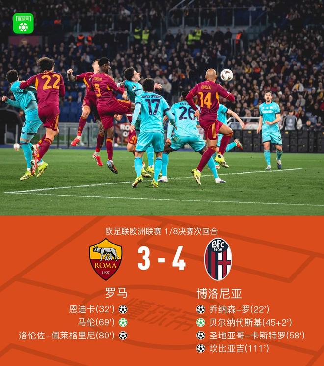 北京時間3月20日歐足聯歐洲聯賽 1/8決賽次回合,羅馬對陣博洛尼亞。上半場羅首開記錄,隨後恩迪卡破門扳平,貝爾納代斯基點射破門領先,下半場卡斯特羅破門擴大比分,馬倫點射破門佩萊格裡尼破門扳平比分。加時賽坎比亞吉破門制勝。最終比分羅馬 3-4 博洛尼亞。兩回合總比分羅馬4-5博洛尼亞。