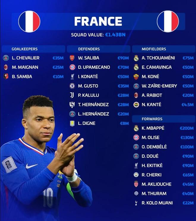 新一期法國隊身價榜:姆巴佩、奧利塞前2,26人總身價14.3億